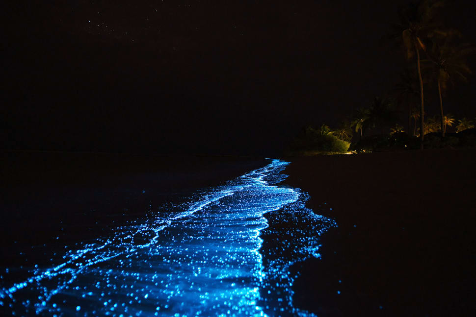 When the sun sets in the sky, near the shore of Vaadhoo Island, you will see a thousand tiny fluorescent blue specks glowing in the ocean. Known as the 'Sea of Stars' due to the appearance of stars having fallen into the water, this magical sight is only visible at night and occurs due to the bioluminescent planktons floating near the beach in abundance. This enchanting view is a sight to behold and certainly cannot be missed on your honeymoon in the Maldives.